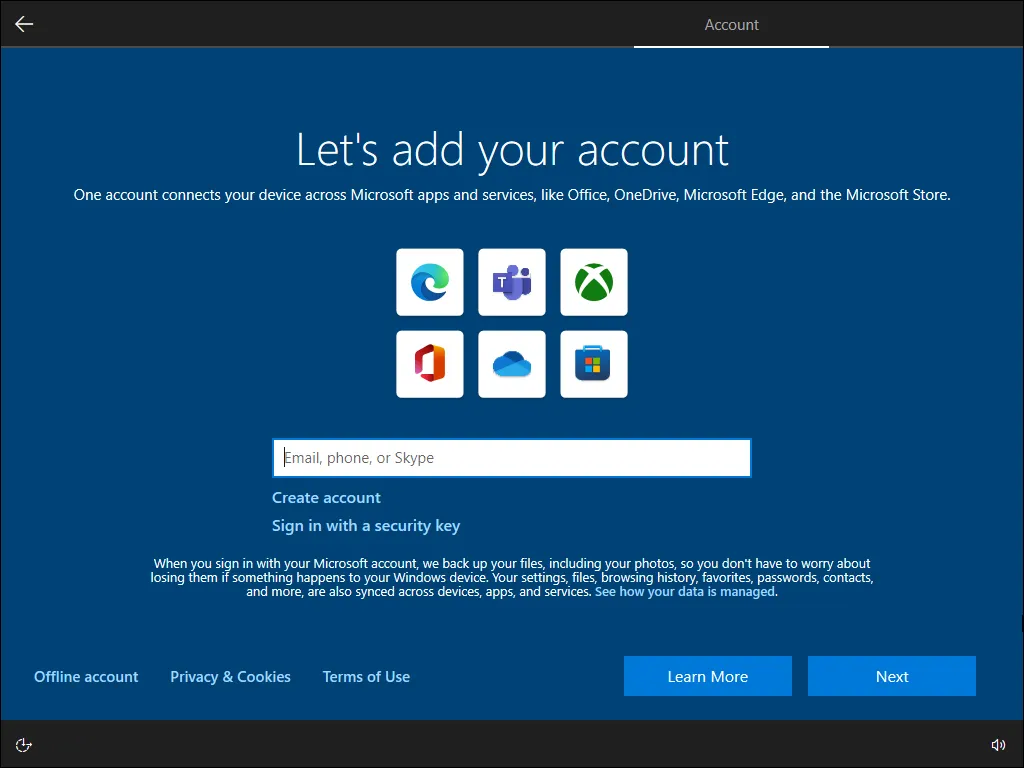 Pada proses ini, Anda diminta untuk menambahkan akun di Windows 10. Anda diberikan 3 pilihan yaitu membuat akun Microsoft baru, log-in menggunakan akun Microsoft, ataupun membuat offline account.