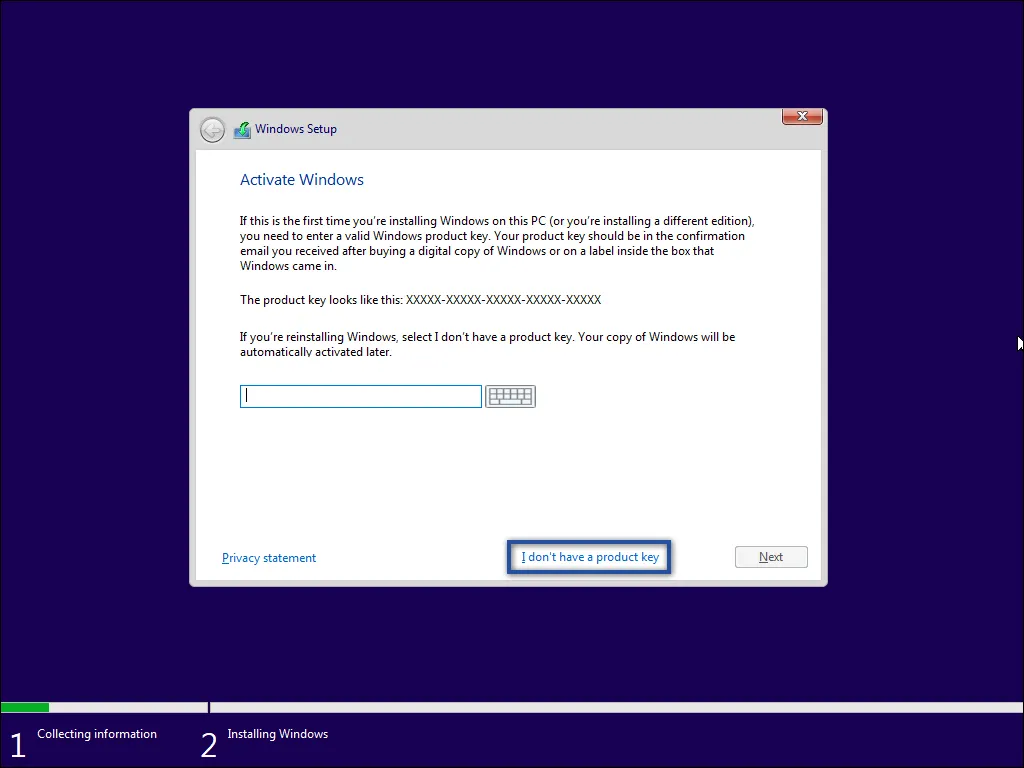 Klik tulisan I don’t have a product key karena kita akan melakukan aktivasi setelah berhasil meng-install Windows 10.