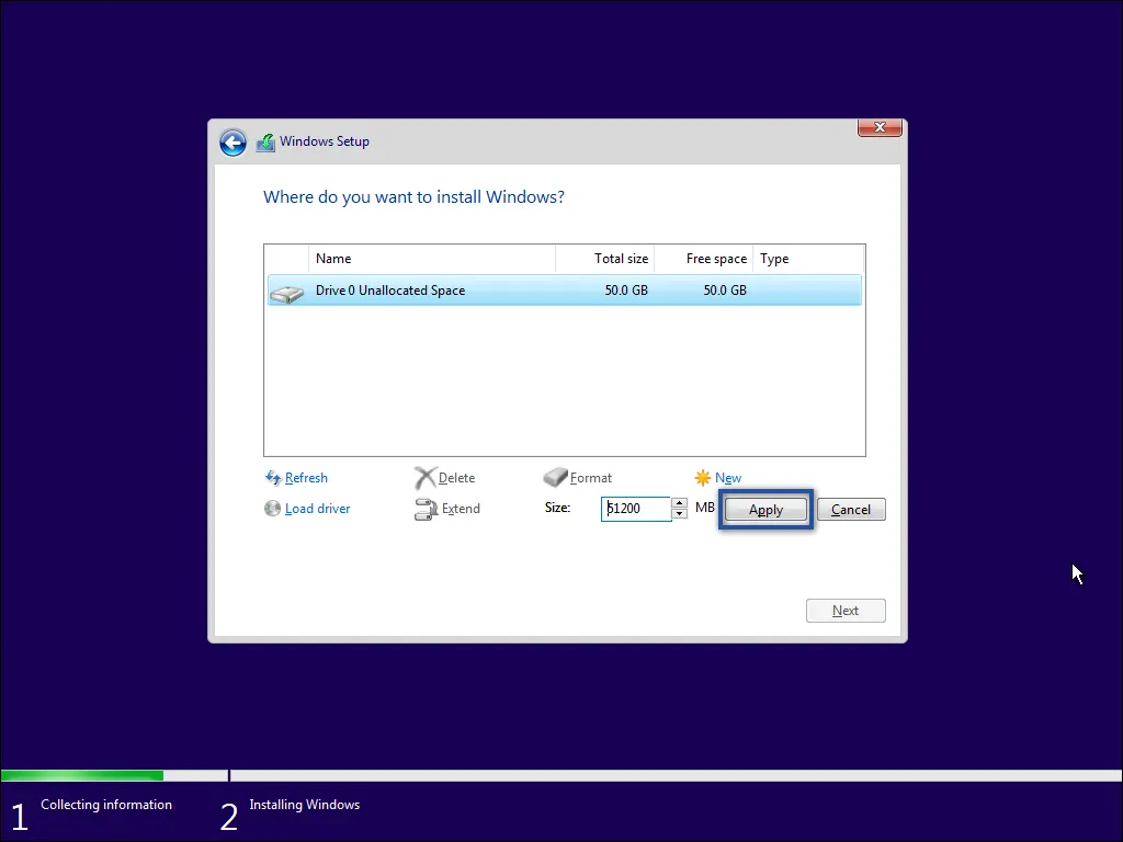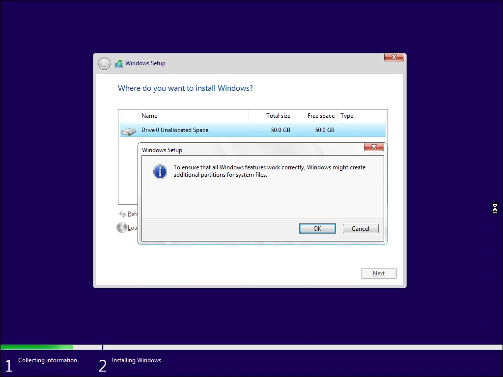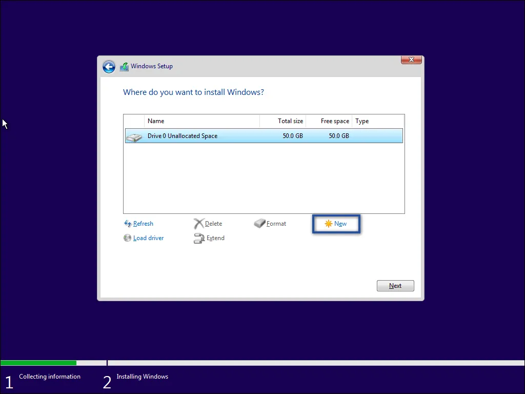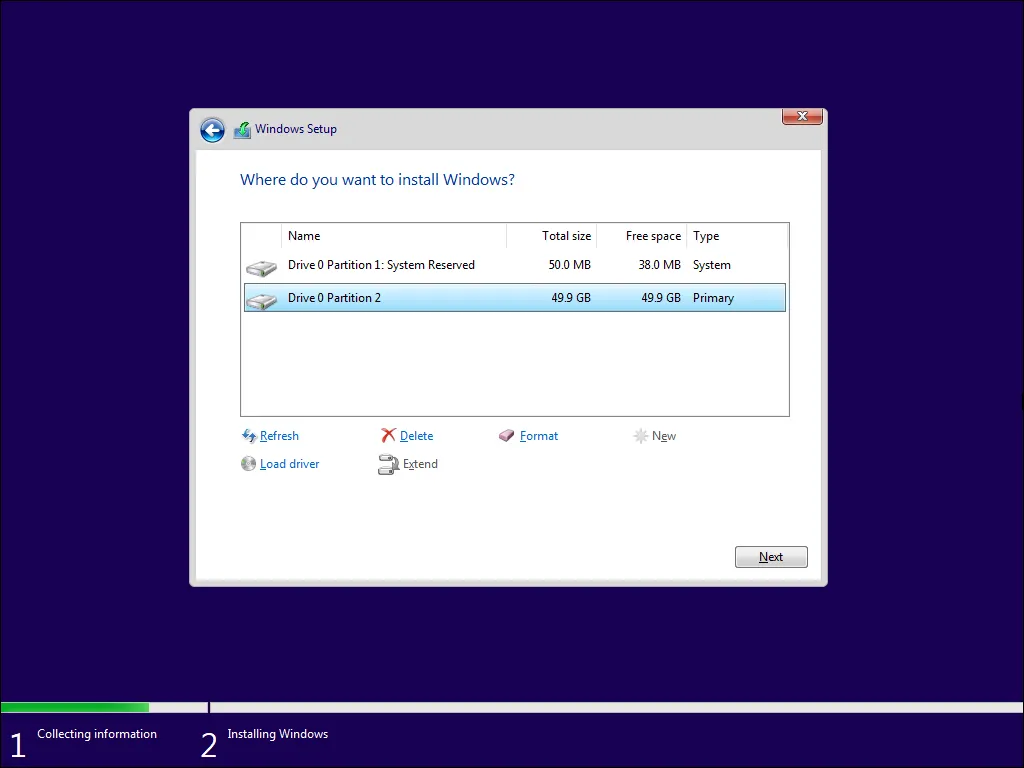 Pilihlah hard drive atau partisi yang ingin Anda install Windows 10. Pada panduan ini, menggunakan hard disk berkapasitas 50 GB. Apabila Anda memiliki beberapa hard drive ataupun partisi, Anda bisa melakukan partisi secara mandiri. Atau Anda nantinya bisa melakukan partisi menggunakan software lain setelah proses instalasi Windows 10 selesai.