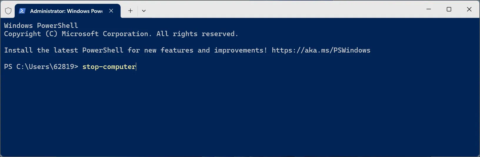 Ketika muncul jendela Powershell (memiliki rupa seperti cmd) isi bagian perintahnya dengan stop-computer kemudian tekan Enter.