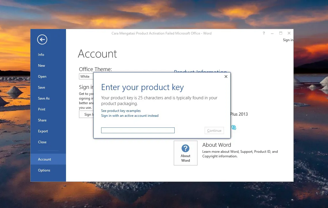 Dalam beberapa kondisi tertentu, Microsoft Office meminta Anda untuk memasukkan ulang kode lisensi resminya karena alasan khusus. Mungkin saja, ini dikarenakan Anda menggunakan software bajakan yang mana lisensinya tidak bersifat permanen atau bisa jadi dikarenakan Anda menginstall versi Trial. Berikut langkah-langkah yang Anda perlukan untuk memasukkan Product Key Microsoft Office.