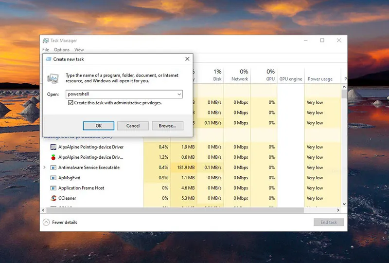 Step 1: Pertama, masuk ke dalam Task Manager untuk membuka Windows Powershell.