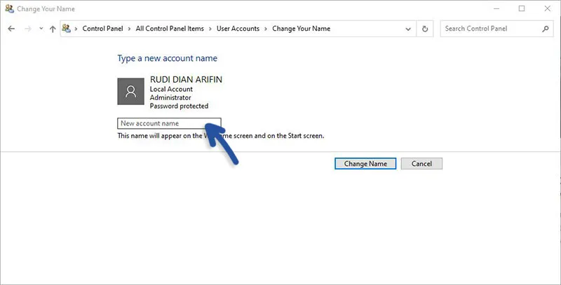 Kemudian Anda tinggal tuliskan nama baru untuk akun Anda. Jika sudah, Anda tinggal klik Change Name dan restart komputer Anda.