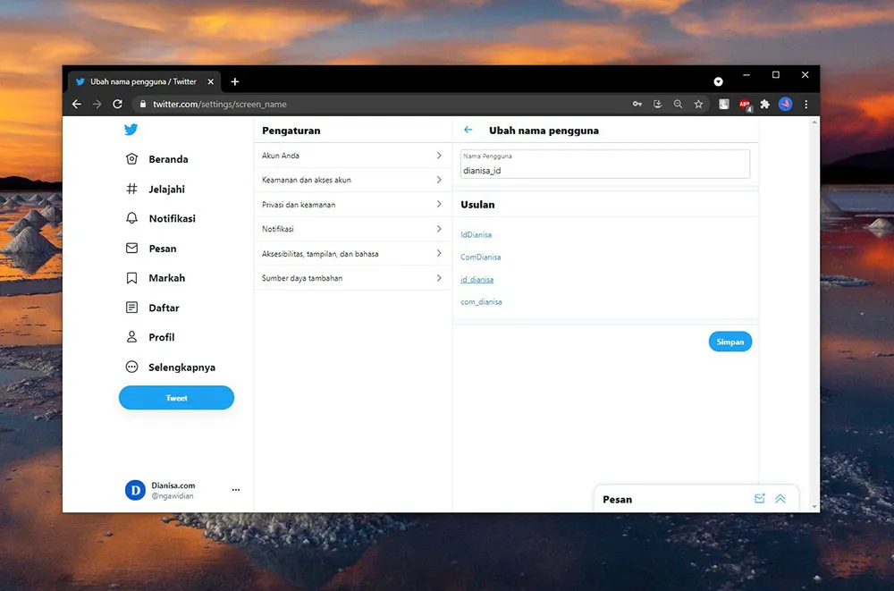 Selanjutnya, masukkan nama pengguna (username) baru yang Anda inginkan. Jika tersedia, Anda bisa klik Simpan.