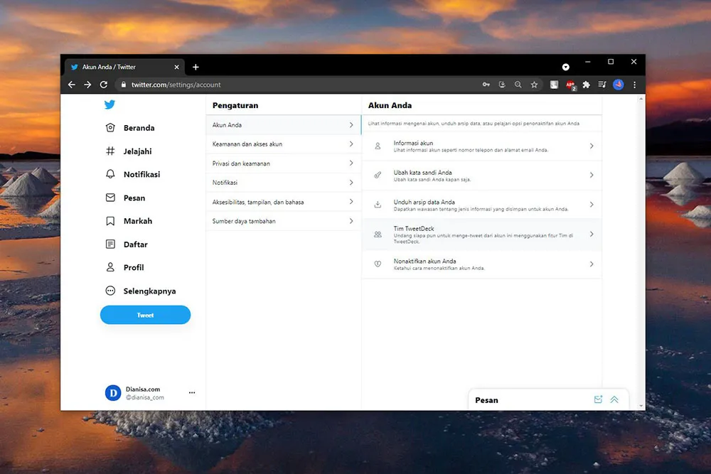 Pertama, buka Twitter melalui browser komputer/ laptop yang Anda miliki. Login menggunakan email dan kata sandi Twitter yang Anda gunakan. Pada halaman beranda Twitter, pilih fitur Selengkapnya.