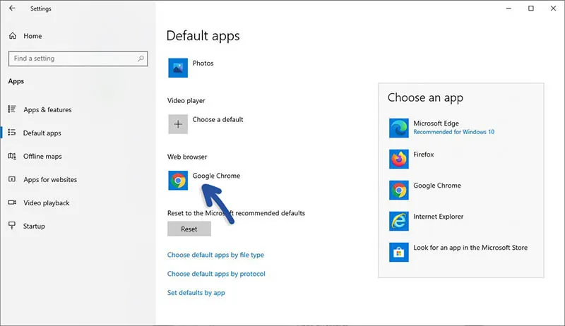 Pada fitur tersebut, klik Default Apps. Scrool ke bawah, kemudian klik browser yang ada di bagian Web browser. Lalu, pilih browser yang Anda inginkan.