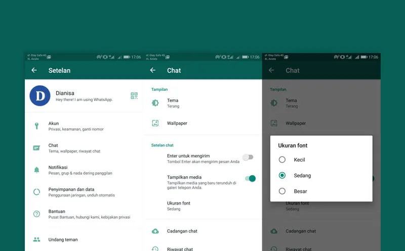 Obrolan atau Chatting di WhatsApp Android memang terasa sangat menyenangkan. Aplikasi messenger dengan pengguna lebih dari 1 Milyar ini terbilang ringan dan optimal pada semua perangkat Android dan iPhone (iOS). Ukuran font pada WhatsApp, default-nya medium dengan ukuran sedang, tidak terlalu besar dan tidak terlalu kecil. Bagi Anda yang tidak suka dengan ukuran tersebut, Anda bisa mengubahnya menjadi lebih kecil/ lebih besar. Untuk lebih jelasnya, simak ulasannya berikut ini.