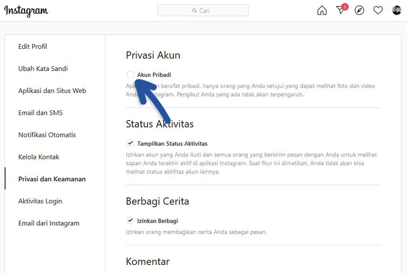 Sama seperti tutorial diatas, anda cukup masuk ke fitur Privasi kemudian matikan fitur Akun Privat. Dengan begitu, akun Instagram anda kembali ke akun publik.