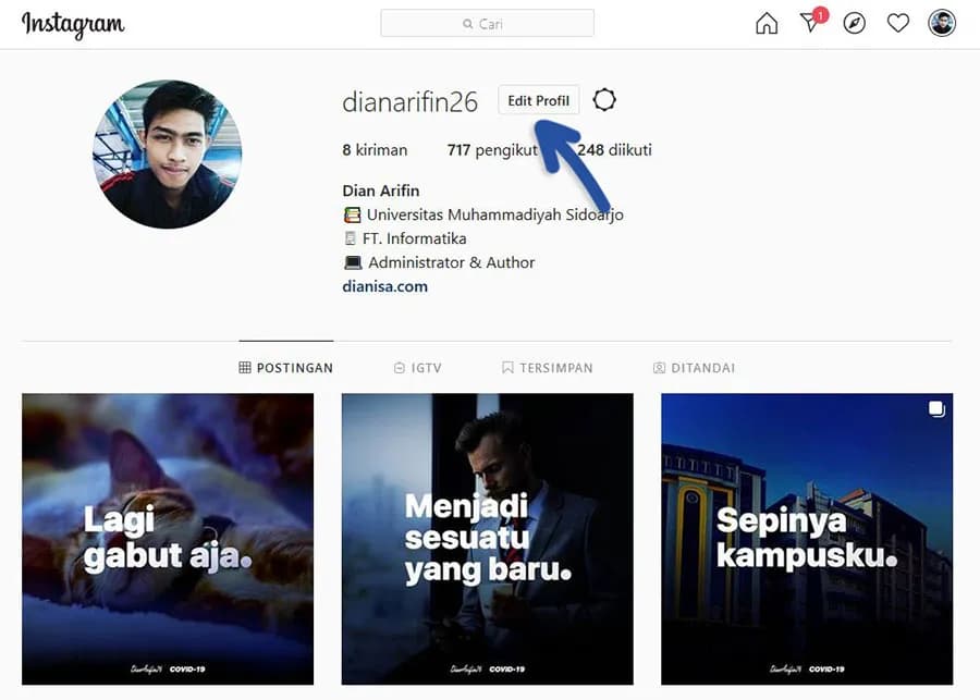 STEP 1: Langkah pertama, silakan bukan Instagram lewat browser komputer atau smartphone Anda. Selanjutnya, masuk ke halaman Profil Instagram Anda. Pilih menu Edit Profil.