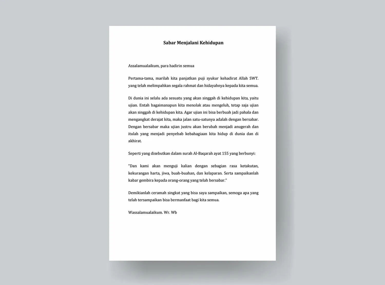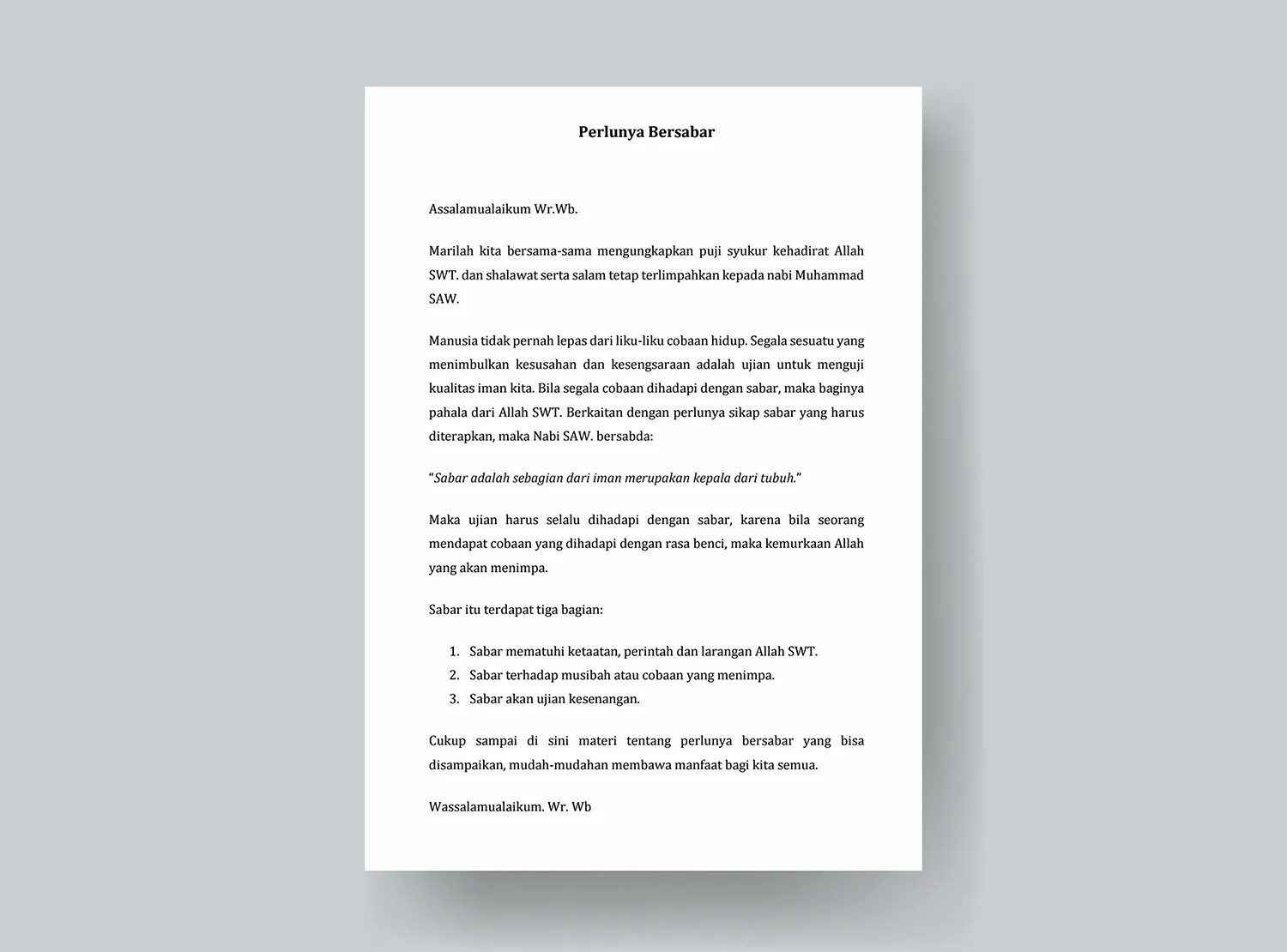Dalam kesempatan kali ini izinkan saya memberikan ceramah singkat yang berjudul Sabar dalam Menghadapi Cobaan.