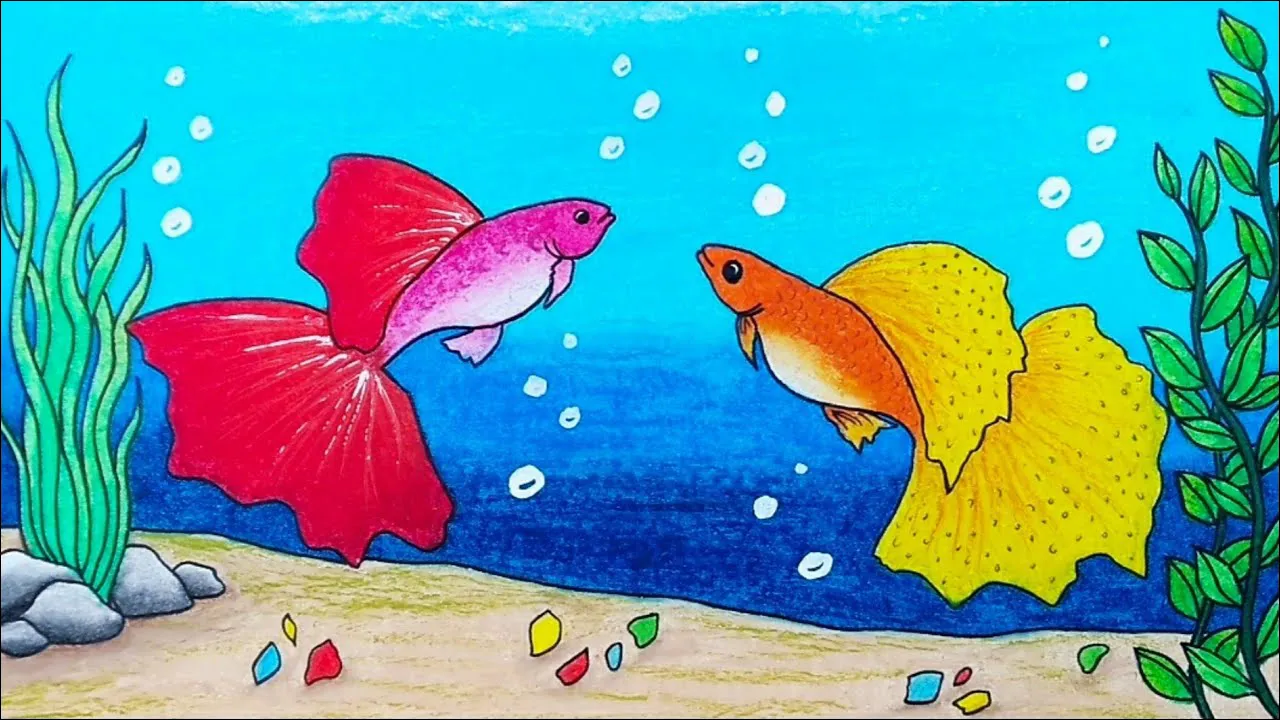 Sebaiknya mulai dengan bentuk dasar yang sederhana, seperti oval untuk badan ikan dan lingkaran untuk mata. Gunakan warna-warna cerah untuk menarik perhatian mereka.