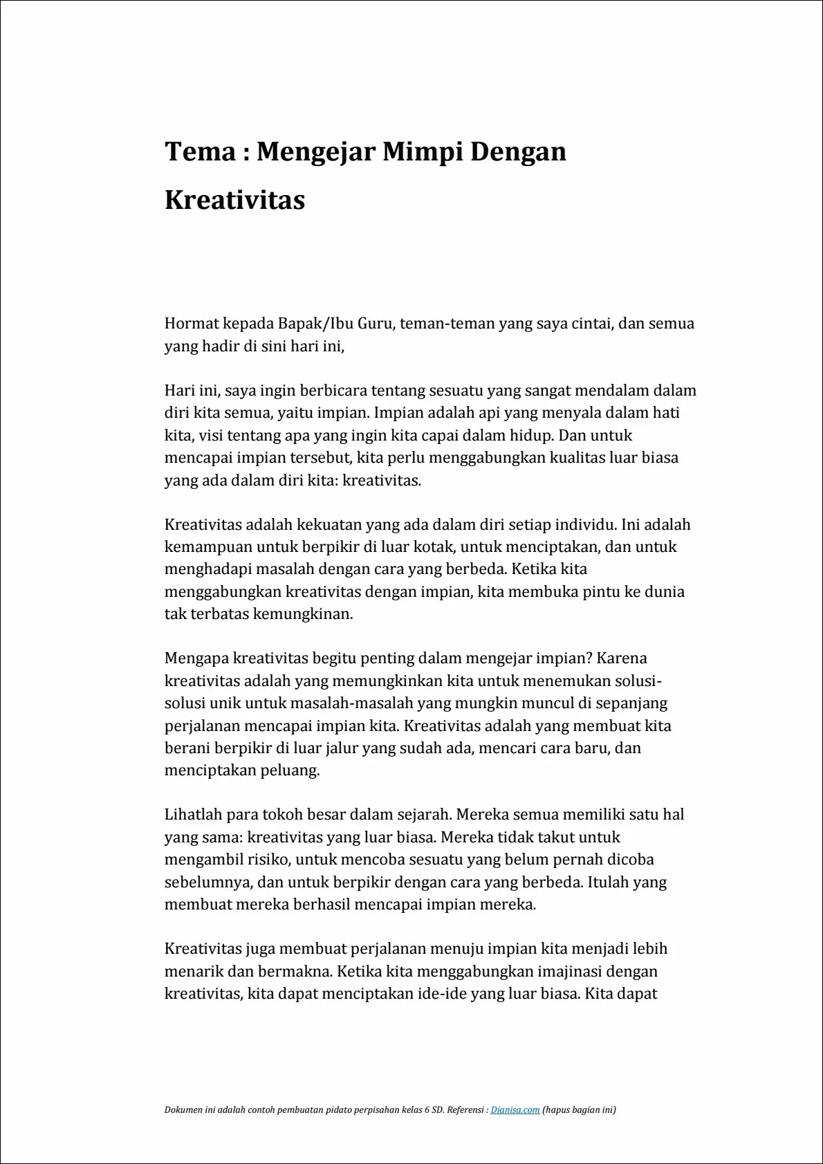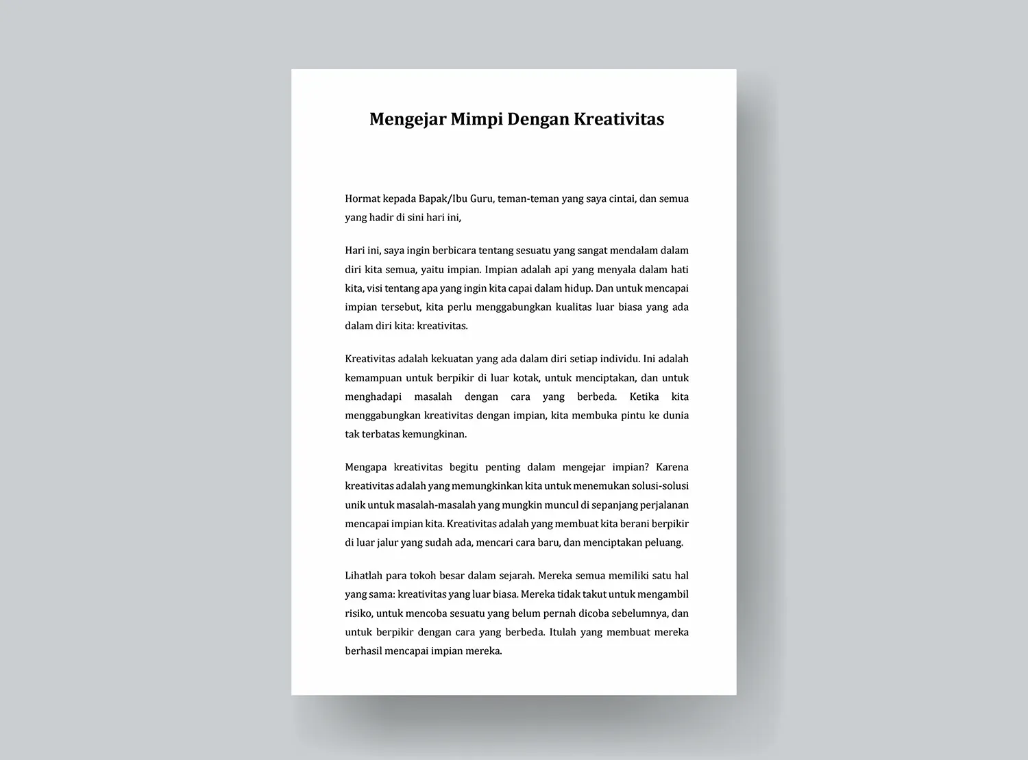 Jadi, teman-teman, mari kita selalu berani bermimpi besar, dan mari kita selalu menjadikan kreativitas sebagai teman setia kita dalam perjalanan menuju impian itu. Ketika kita menggabungkan mimpi dengan kreativitas, tidak ada yang tidak mungkin.