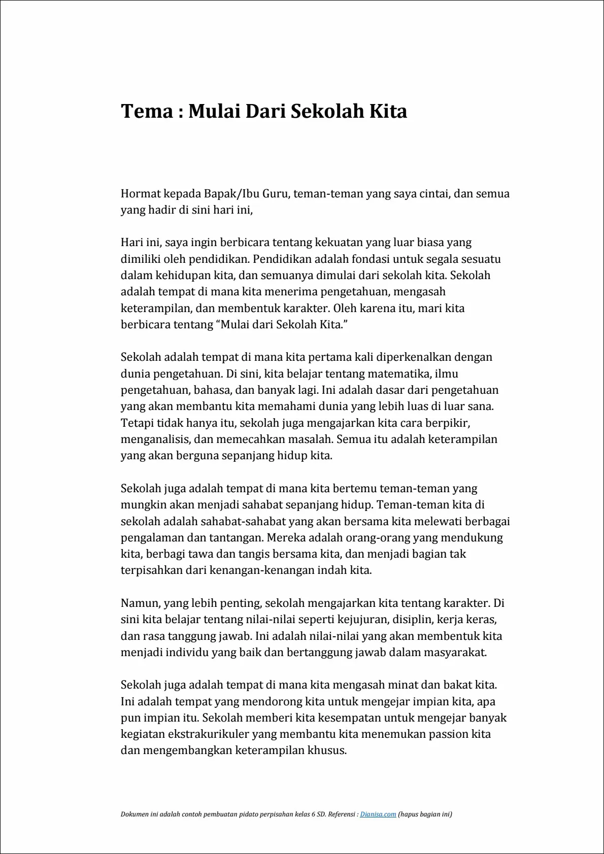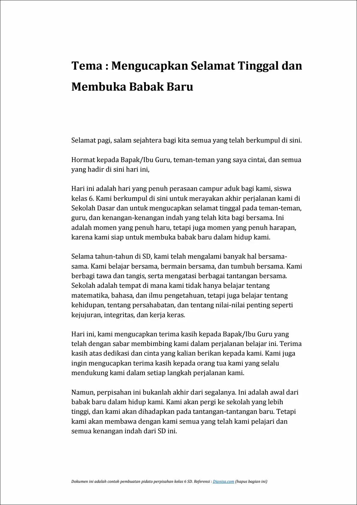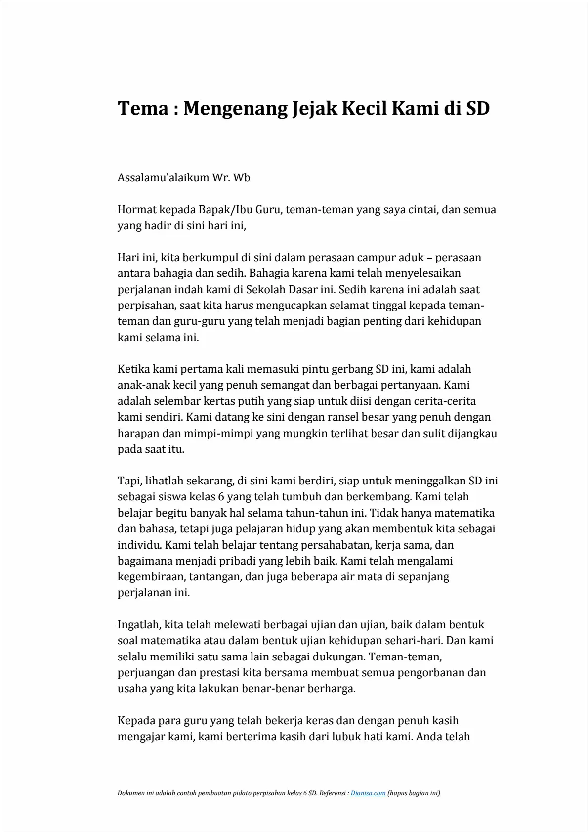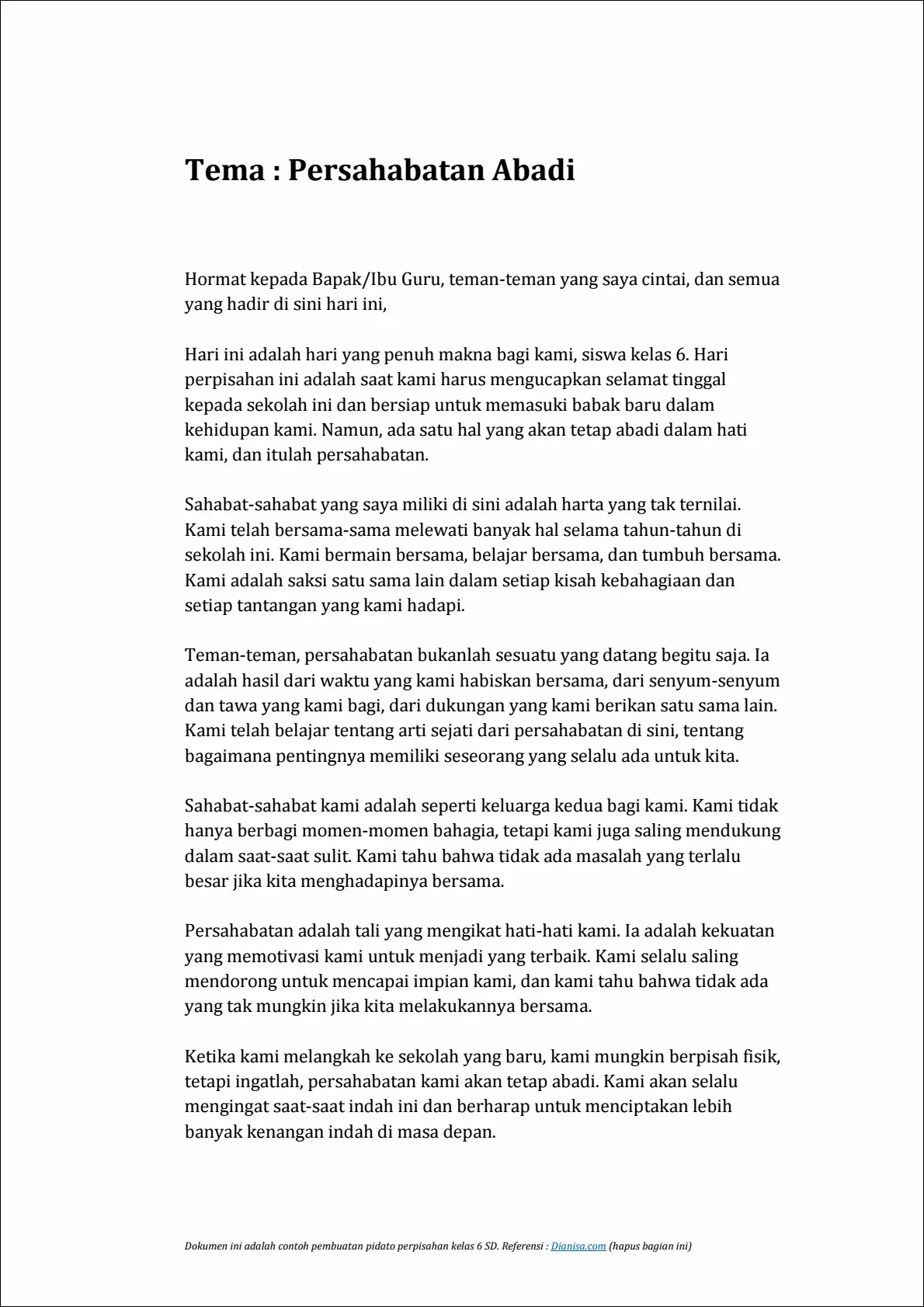 Teman-teman, kami telah berbagi banyak kenangan bersama selama tahun-tahun ini. Dari tugas-tugas rumah yang sulit hingga permainan di halaman sekolah, kita telah tumbuh bersama-sama. Saya yakin bahwa persahabatan kita akan terus berkembang bahkan ketika kita pergi ke sekolah yang berbeda.