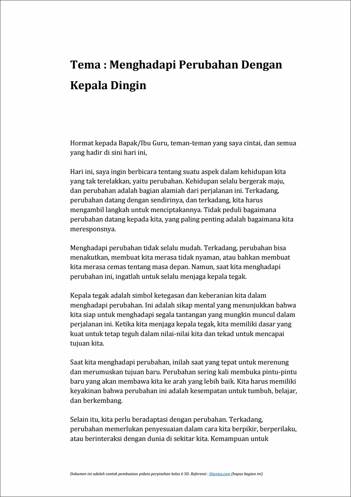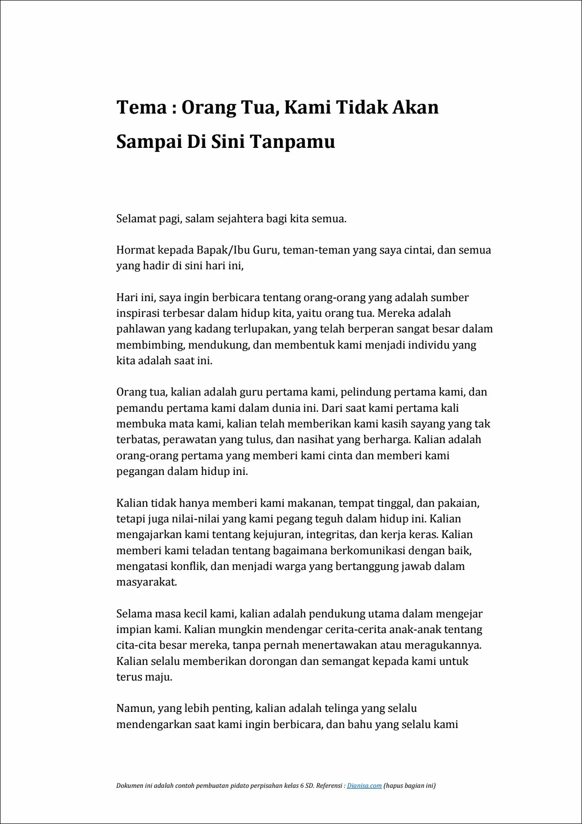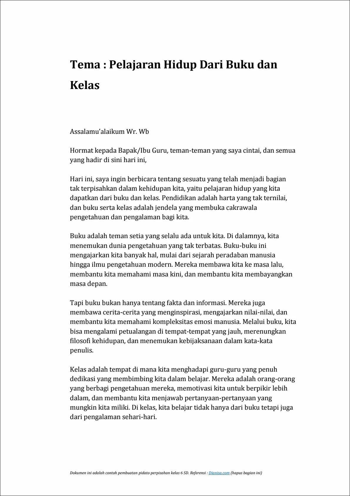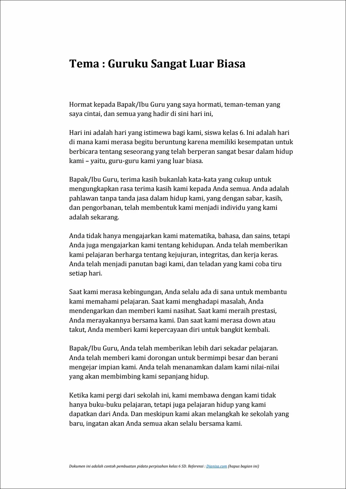 Teman-teman, kami telah berbagi banyak kenangan bersama selama tahun-tahun ini. Dari tugas-tugas rumah yang sulit hingga permainan di halaman sekolah, kita telah tumbuh bersama-sama. Saya yakin bahwa persahabatan kita akan terus berkembang bahkan ketika kita pergi ke sekolah yang berbeda.