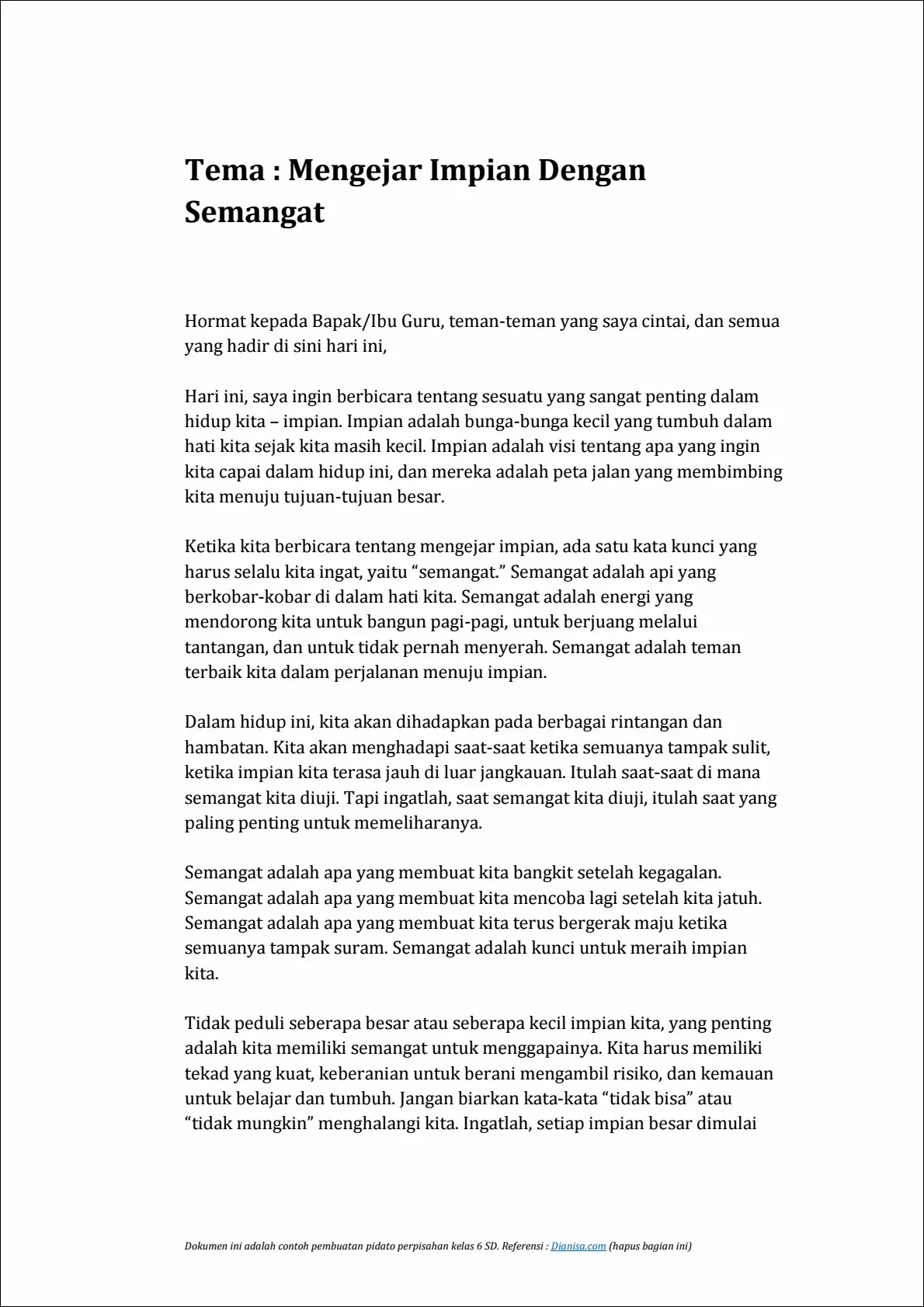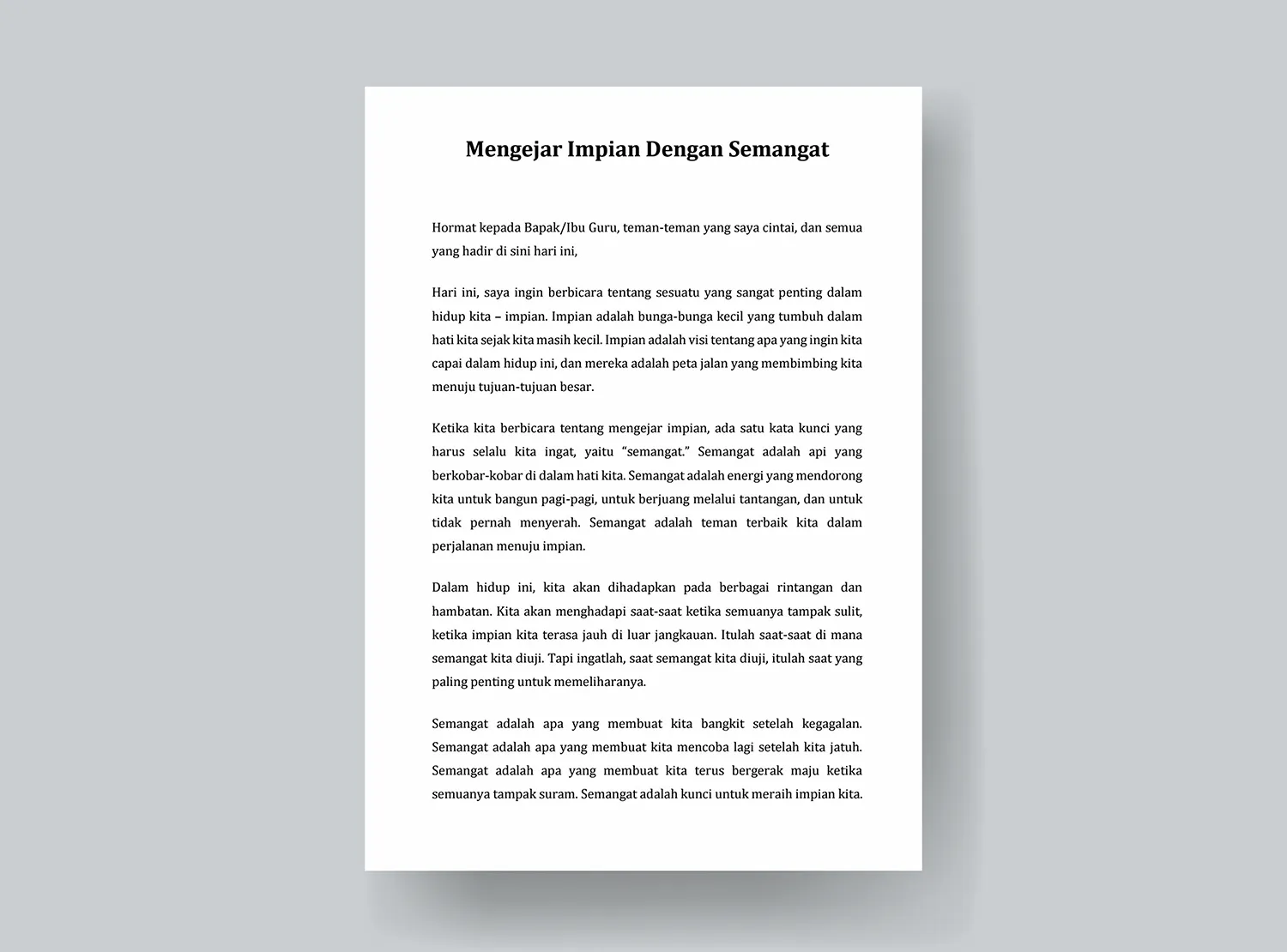 Hari ini, saya ingin berbicara tentang sesuatu yang sangat penting dalam hidup kita – impian. Impian adalah bunga-bunga kecil yang tumbuh dalam hati kita sejak kita masih kecil. Impian adalah visi tentang apa yang ingin kita capai dalam hidup ini, dan mereka adalah peta jalan yang membimbing kita menuju tujuan-tujuan besar.