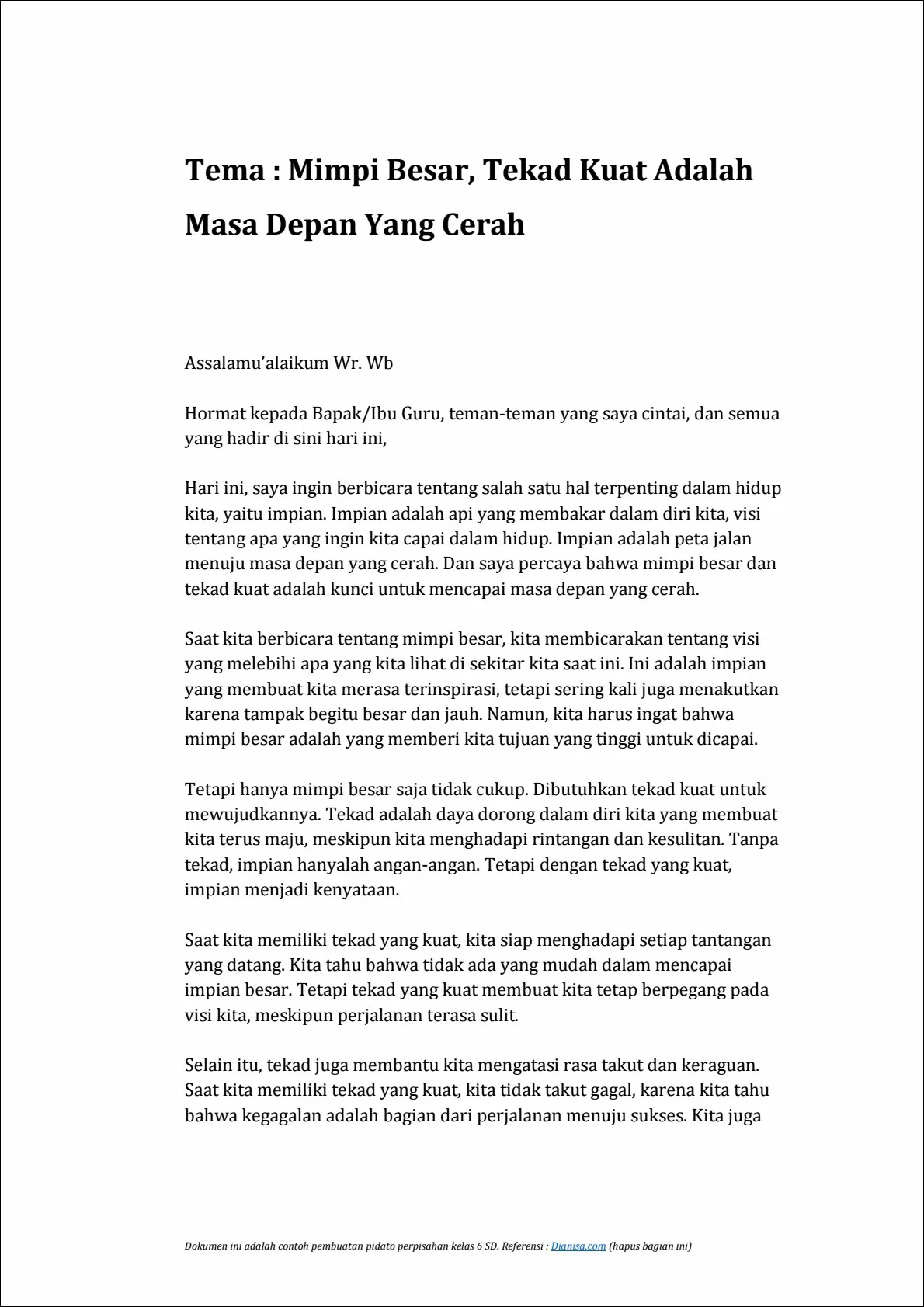 Jadi, teman-teman, mari kita bermimpi besar, dan mari kita pegang teguh tekad kita. Mari kita terus berjuang untuk mencapai impian kita, meskipun kita mungkin menghadapi rintangan dan kesulitan. Dengan mimpi besar dan tekad kuat, masa depan kita akan bersinar cerah.