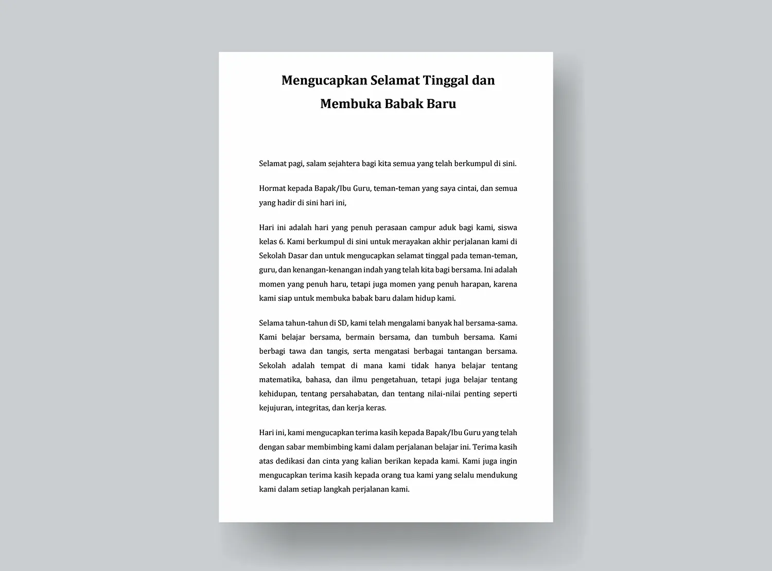 Hari ini, kami mengucapkan terima kasih kepada Bapak/Ibu Guru yang telah dengan sabar membimbing kami dalam perjalanan belajar ini. Terima kasih atas dedikasi dan cinta yang kalian berikan kepada kami. Kami juga ingin mengucapkan terima kasih kepada orang tua kami yang selalu mendukung kami dalam setiap langkah perjalanan kami.