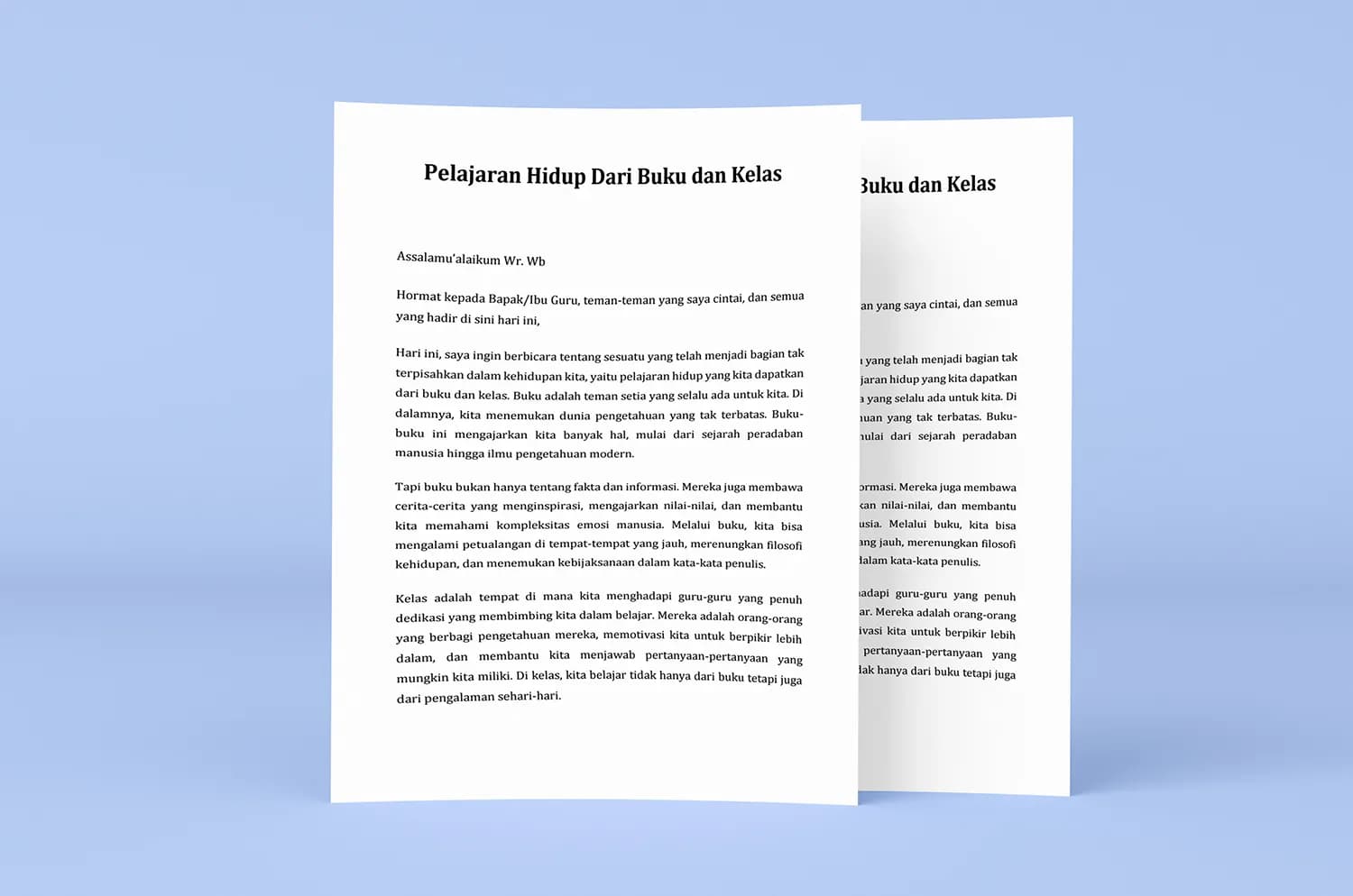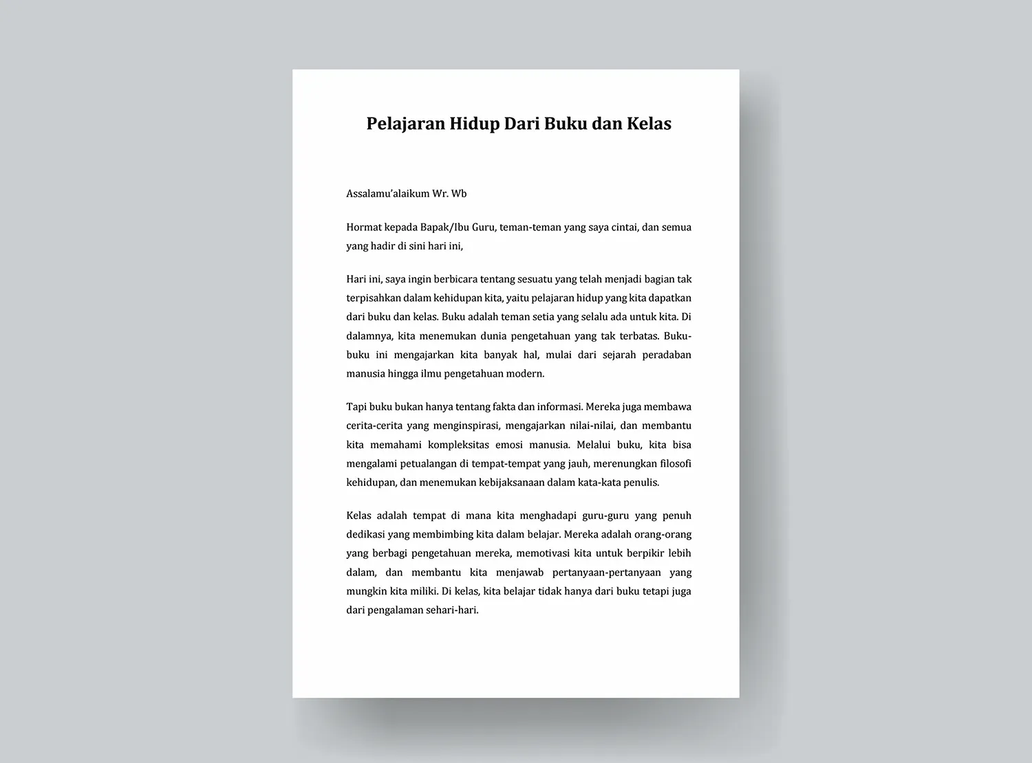 Hari ini, saya ingin berbicara tentang sesuatu yang telah menjadi bagian tak terpisahkan dalam kehidupan kita, yaitu pelajaran hidup yang kita dapatkan dari buku dan kelas. Pendidikan adalah harta yang tak ternilai, dan buku serta kelas adalah jendela yang membuka cakrawala pengetahuan dan pengalaman bagi kita.