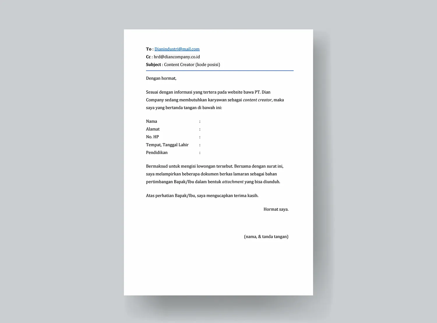 Surat lamaran ini biasanya ditujukan pada kepala instansi atau manajer Human Resource Development (HRD) yang bertanggung jawab atas program rekrutmen yang sedang dilakukan.