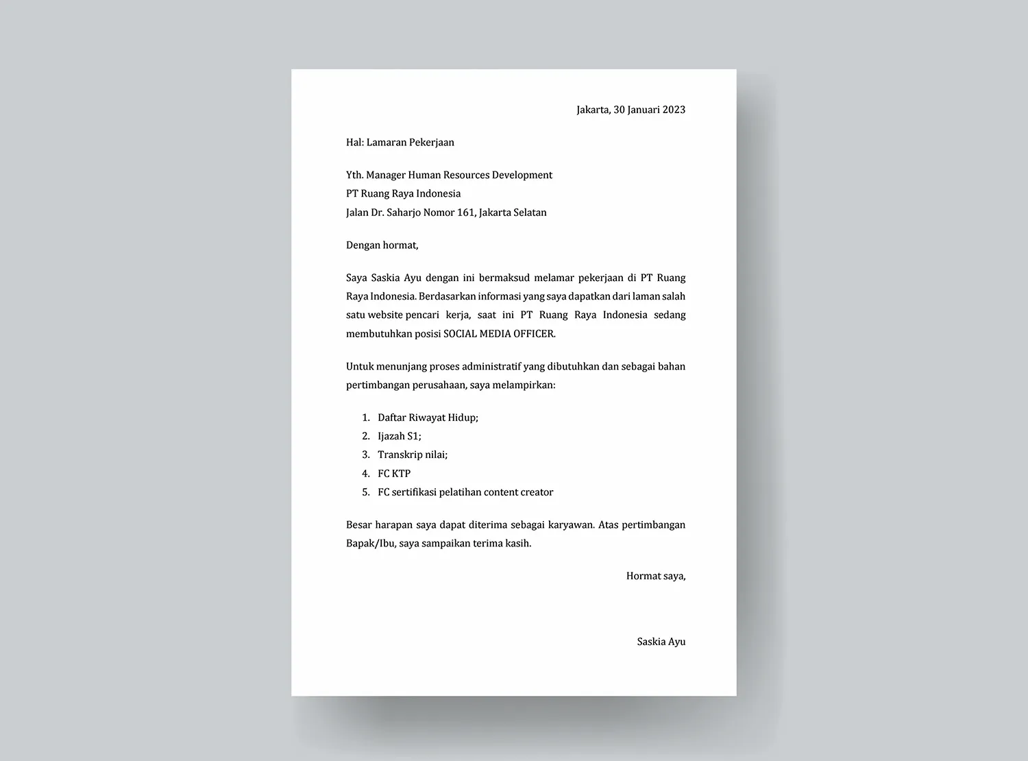 Saya Saskia Ayu dengan ini bermaksud melamar pekerjaan di PT Ruang Raya Indonesia. Berdasarkan informasi yang saya dapatkan dari laman salah satu website pencari kerja, saat ini PT Ruang Raya Indonesia sedang membutuhkan posisi SOCIAL MEDIA OFFICER.