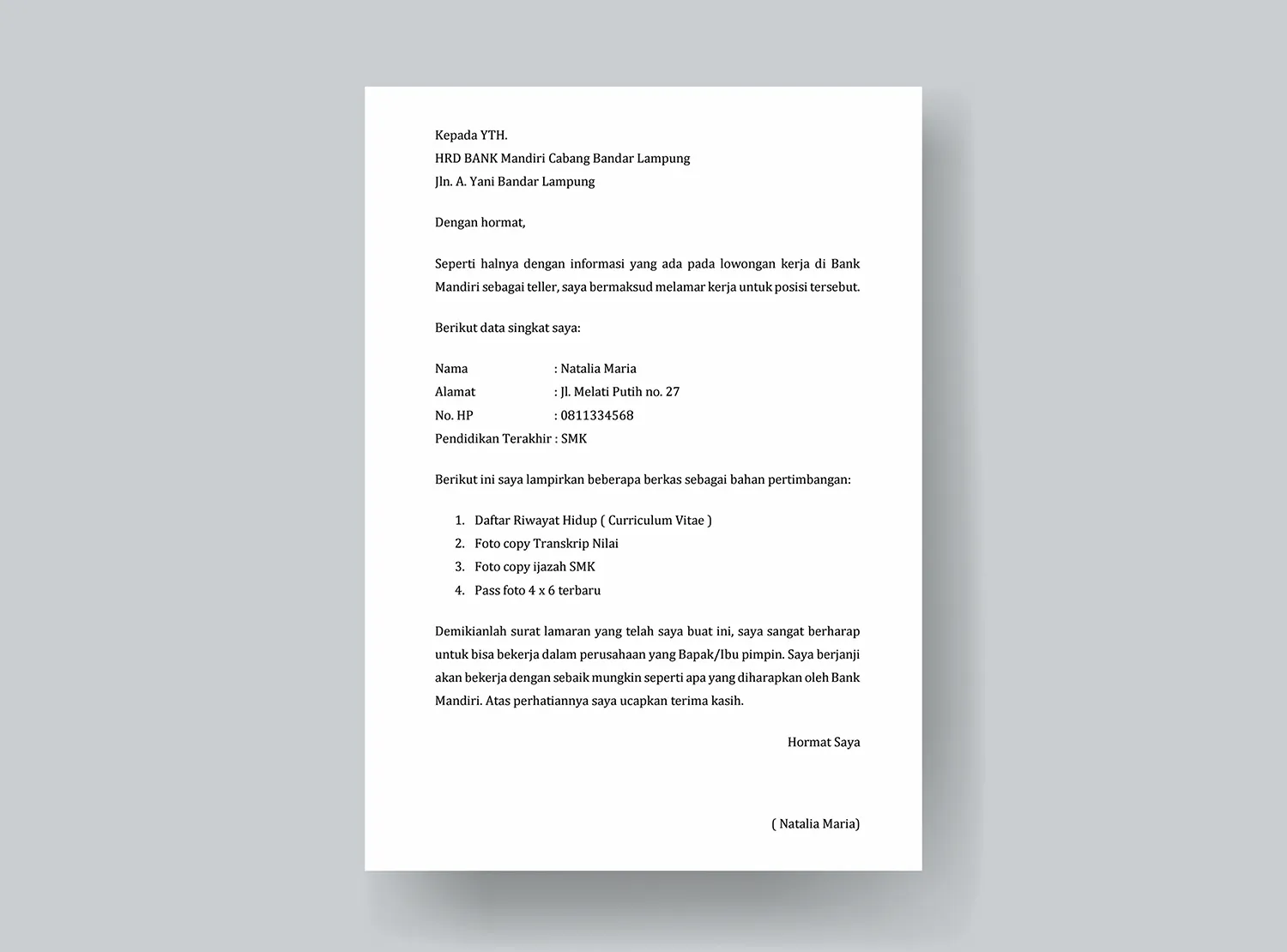 Demikianlah surat lamaran yang telah saya buat ini, saya sangat berharap untuk bisa bekerja dalam perusahaan yang Bapak/Ibu pimpin. Saya berjanji akan bekerja dengan sebaik mungkin seperti apa yang diharapkan oleh Bank Mandiri. Atas perhatiannya saya ucapkan terima kasih.