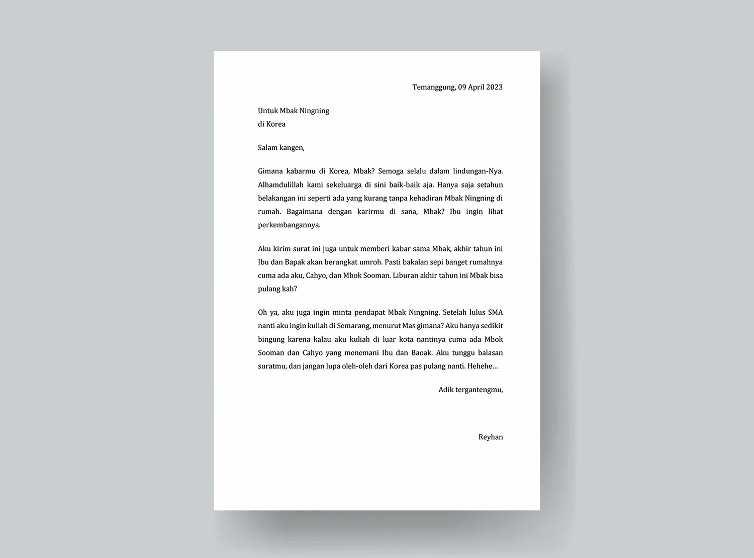 Apa kabar Syifa? Semoga kamu dan keluarga sehat wal afiat. Rara di sini juga sehat. Begitu juga dengan orang tua dan kakakku.