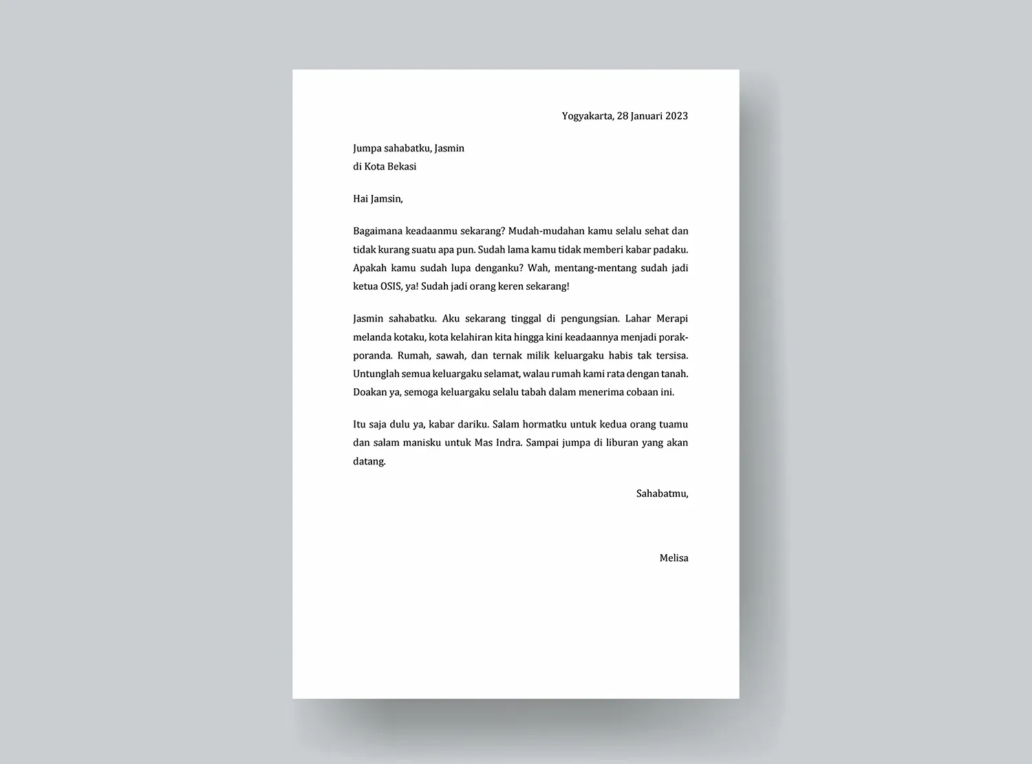 Salam hangat Bagas, aku dapat kabar soal kesehatanmu. Pakde-mu yang kasih tahu. Sedih mendengar kamu kena demam berdarah dan harus masuk rumah sakit. Maaf aku tidak sempat berpamitan saat pindah rumah. Kamu masih ada kemah sedangkan aku sekeluarga harus buru-buru pindah. Tapi aku masih akan sering-sering main ke Jambi. Awal tahun depan kami akan habiskan liburan di sana. Aku kirimkan buah jambu merah yang tumbuh di pekarangan rumah baruku. Katanya buah jambu merah baik untuk memulihkan pasien demam berdarah. Tak sabar berjumpa di awal tahun depan. Semoga saat itu kita sudah bisa main bola lagi di lapangan dekat rumahmu. Ketika membaca surat ini, kuharap bisa menambah semangatmu untuk lekas pulih.