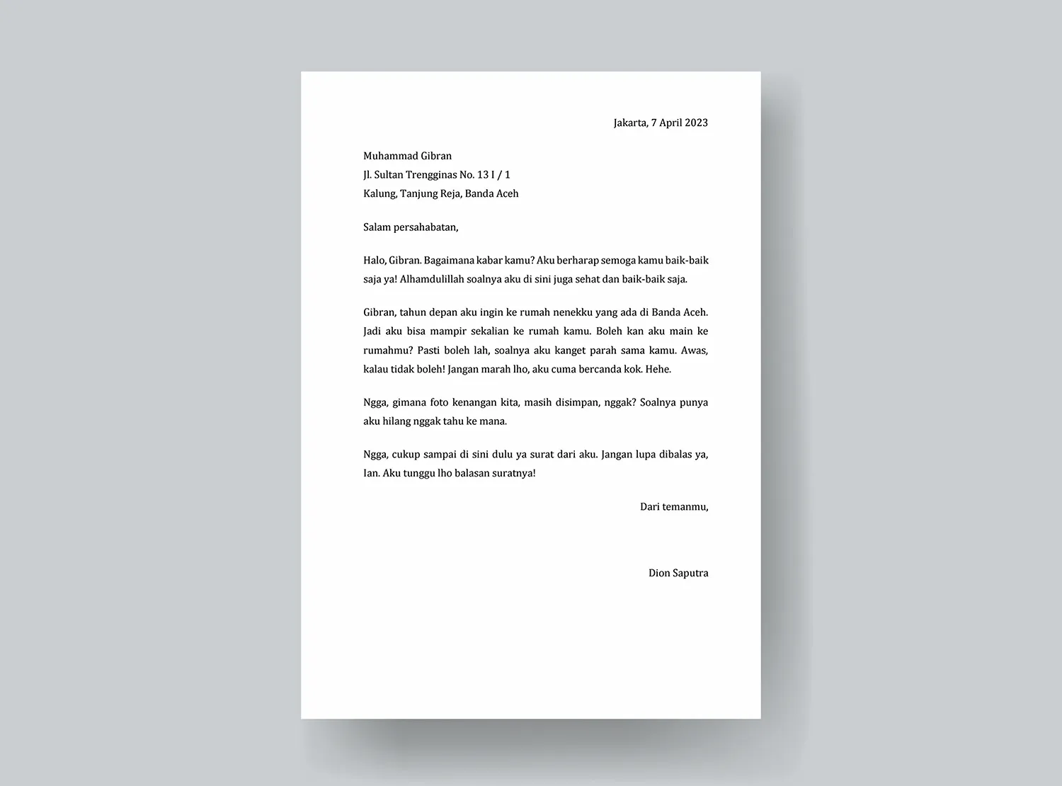 Dalam surat pribadi, pengirim biasanya menggunakan nama asli penerima atau panggilan akrab yang dipakai secara informal. Hal ini mencerminkan kedekatan dan keakraban hubungan antara pengirim dan penerima.
