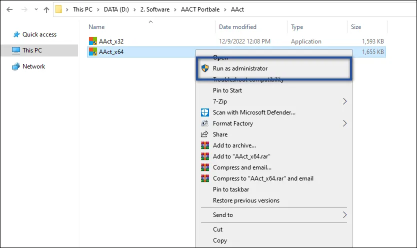 Step 3: Buka aplikasi AAct Portable sesuai dengan arsitektur PC atau laptop Anda dengan klik kanan dan pilih Run as Administrator.