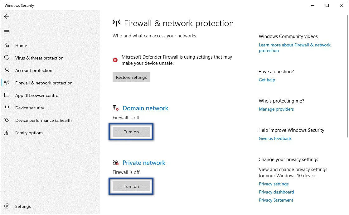 Step 3: Matikan juga Firewall, pada Windows Security » pilih Firewall & Network Protection » Matikan Domain Network, Private Network dan Public Network.