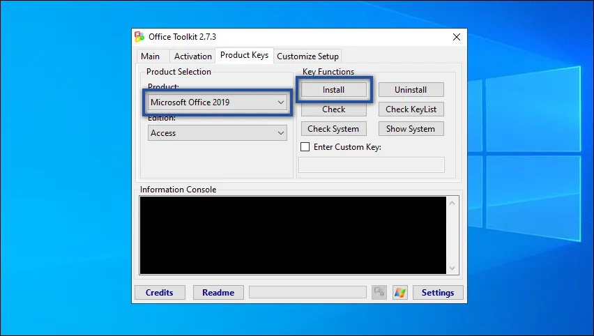 Step 4: Klik tab Product Keys, pilih Microsoft Office 2019 dan klik Install.