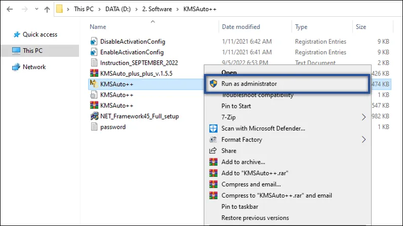 Step 5: Kalau sudah, Anda klik kanan file KMSAuto++ dan pilih Run as Administrator.