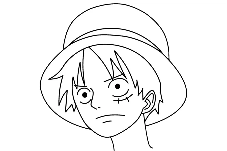 Pastikan untuk menonjolkan mata yang besar, ekspresi wajah yang khas anime, dan tambahkan elemen khas Monkey D. Luffy seperti topi jerami dan tanda segitiga di matanya.