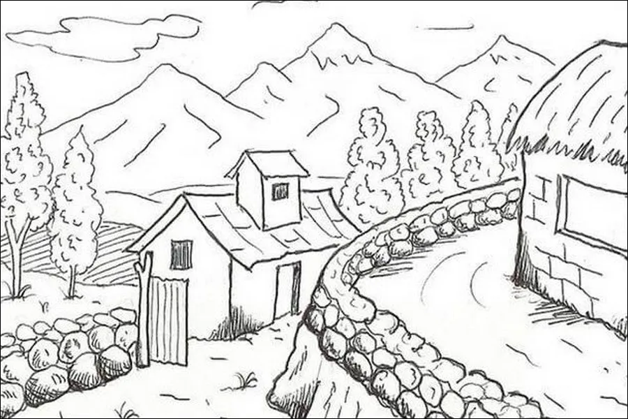 Untuk pelajar SMA, tambahkan detail pada sketsa pedesaan seperti rumah-rumah kecil, pepohonan, dan jalan setapak. Gunakan teknik shading untuk memberikan dimensi pada gambar. Pilih warna-warna alam seperti hijau dan coklat untuk menciptakan atmosfer pedesaan yang tenang.