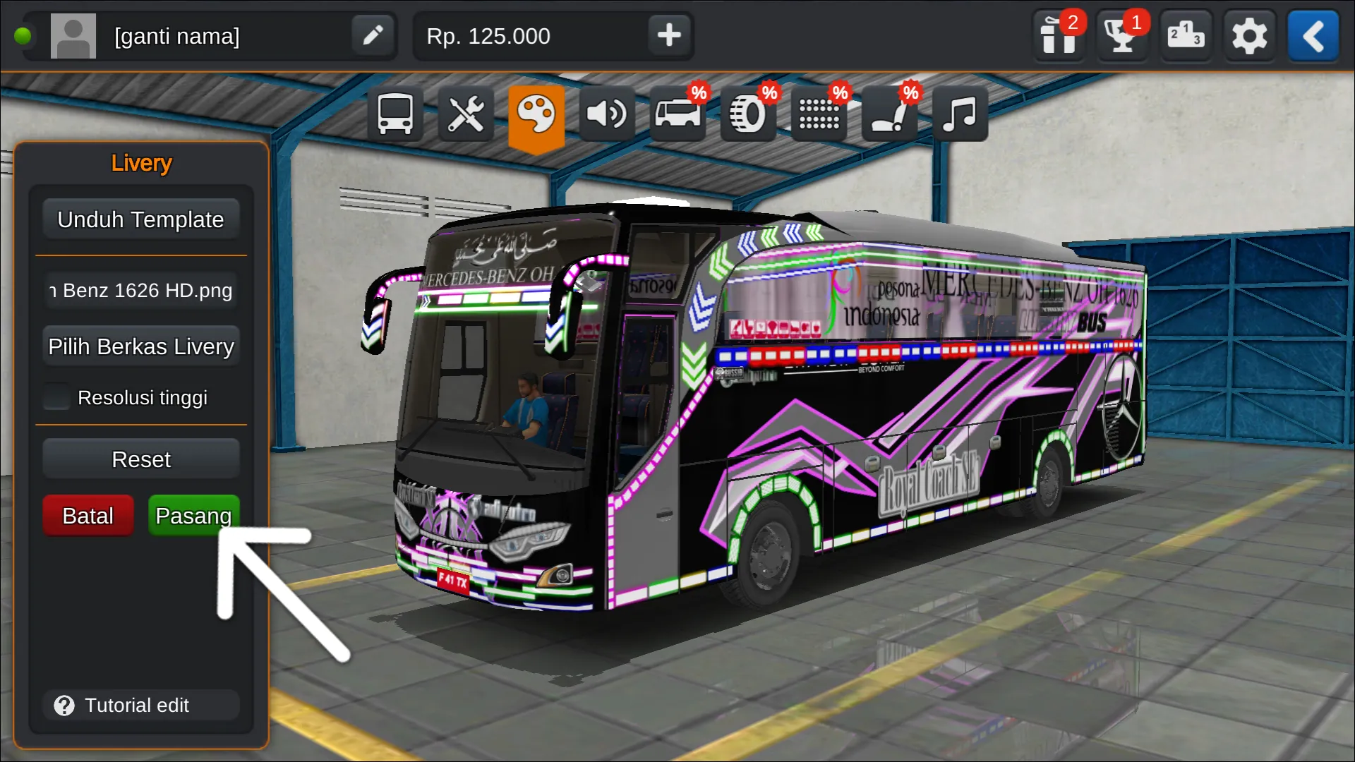 Selanjutnya tekan Pasang untuk menerapkan gambar Livery pada Bus.