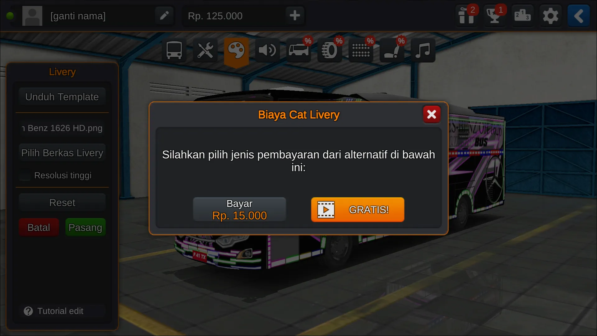 Di sini Anda diberi pilihan antara Bayar atau Gratis dengan menonton iklan. Sebagai imbalan atas pemasangan Livery di BUSSID.