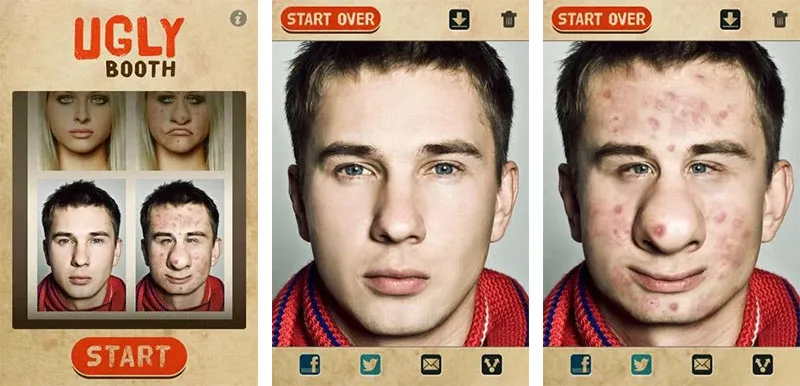 Dari namanya saja tentu sudah bisa kamu tebak aplikasi apa ini. Ugly booth merupakan salah satu aplikasi edit foto lucu yang sangat menarik. Aplikasi ini bisa digunakan untuk mengedit foto menjadi sangat konyol dan jelek secara otomatis. Jadi jika kamu ingin mengedit foto teman kamu yang cantik atau ganteng menjadi jelek, gunakan aplikasi Ugly Booth ini.