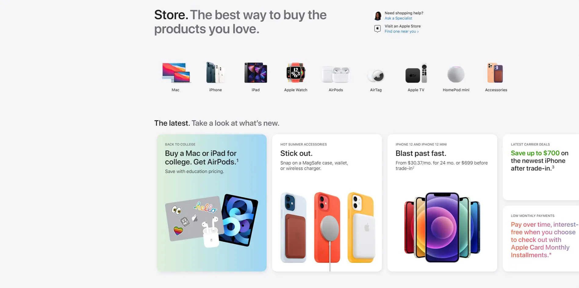 Baru-baru Apple ini telah mengubah antarmuka website toko online miliknya. Website toko Apple kini memiliki desain dengan memperkenalkan tampilan baru dan tab produk pada bagian navigasi atas toko. Di bagian tab toko ini, ada tab icon gambar dengan mencantumkan berbagai kategori produk utama Apple, seperti Mac, iPhone, AirPods, iPad, Apple Watch, dan masih banyak lagi.