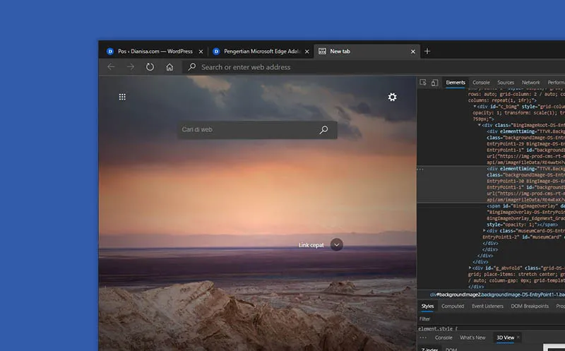 STEP 1: Buka browser Microsoft Edge yang ada di komputer Anda, lalu buat tap baru. Biasanya muncul background Microsoft Edge untuk hari ini. Klik kanan » Inspect, atau bisa juga dengan shortcut keyboard Ctrl+Shift+I.