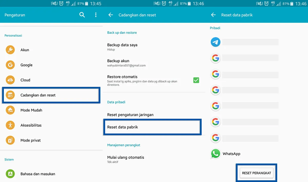 Factory Reset / Hard Reset dapat Anda jadikan pilihan ketika masalah tidak dapat diatasi dengan cara manual. Sebelum melakukan Hard Reset, pastikan untuk melakukan backup data terlebih dahulu. Pindahkan data-data penting yang Anda miliki ke memori eksternal atau komputer. Apabila dalam mengikuti tutorial di atas terdapat perbedaan nama fungsi / fitur, maka Anda bisa menyesuaikannya.