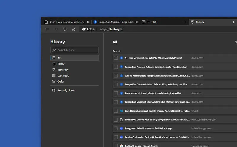 Selain kontrol terhadap akun, pengguna juga perlu menghapus riwayat browser yang ada pada komputer. Selain membersihkan memori komputer, hal ini juga menjadi bagian dalam menjaga privasi. Sebagai antisipasi ketika perangkat kita dipinjam oleh orang lain dan orang tersebut melihat riwayat penjelajahan kita. Pada Microsoft Edge sendiri, ada beberapa cara yang bisa Anda lakukan dalam membersihkan riwayat browser. Mau tahu caranya seperti apa, simak ulasannya berikut ini.