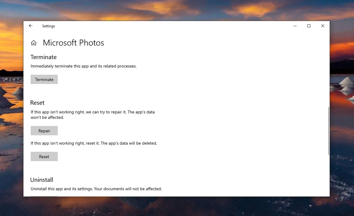 Selanjutnya, Anda juga dapat melakukan reset aplikasi untuk mengatasi Photos yang tidak bisa dibuka. Metode ini dapat memperbaiki permasalahan pesan error “Invalid value for registry” pada aplikasi Photos. Untuk lebih jelasnya, simak langkah-langkah berikut ini.