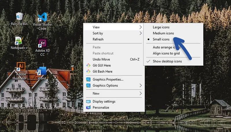 Anda bisa secara langsung mengecilkan icon dengan klik kanan pada desktop, kemudian klik View » lalu pilih mode yang diinginkan, Small icons, Medium icons, atau Large icons. Pilih sesuai keinginan Anda.
