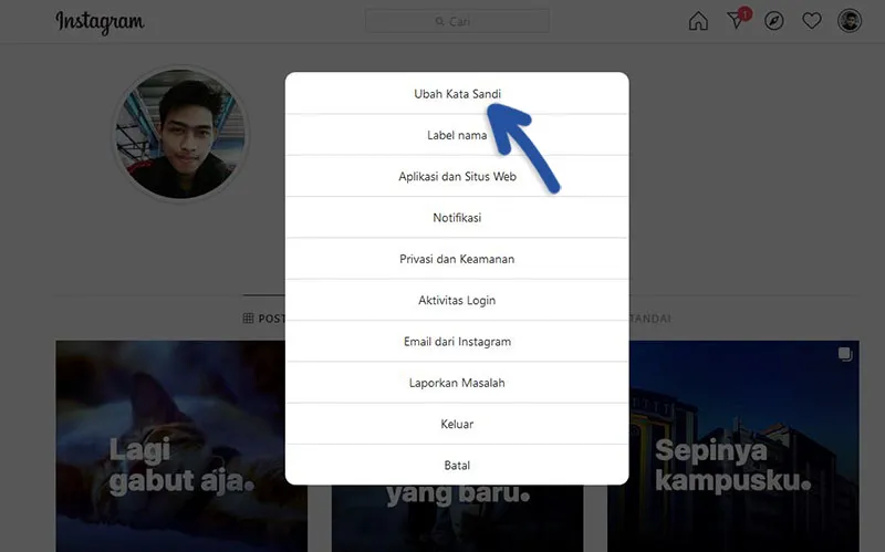 Nantinya akan muncul pop up pilihan, klik Ubah Kata Sandi jika anda ingin mengubah kata sandi Instagram anda.