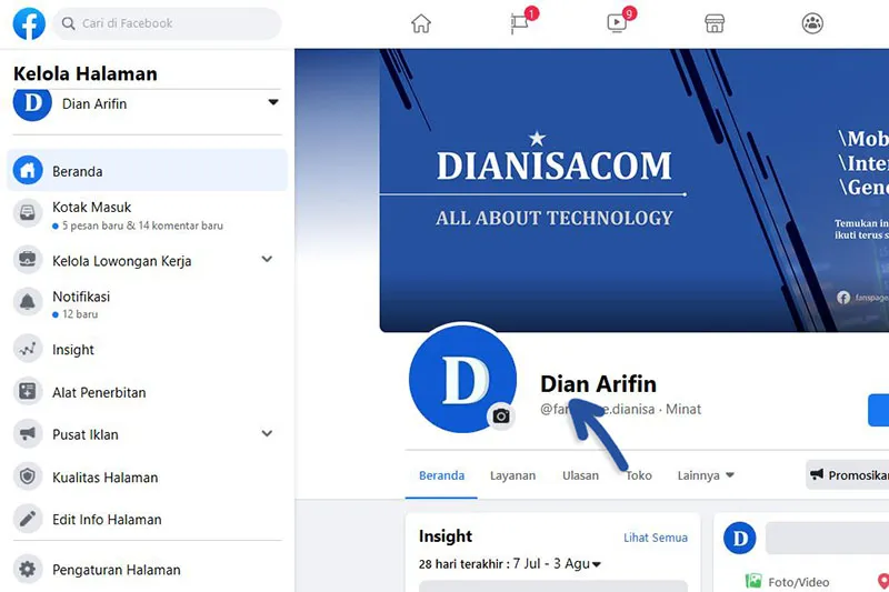 Langkah pertama, silahkan anda menuju menu Pengaturan Halaman di fans page Facebook yang anda miliki. Anda bisa melihat menu tersebut dibagian pojok kiri bawah untuk tampilan halaman Facebook versi terbaru.