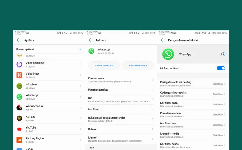 Tips pertama yang bisa Anda lakukan yakni dengan mematikan semua notifikasi / pemberitahuan pesan WhatsApp. Dengan cara ini, Anda tidak lagi terganggu dengan nada dering / banyaknya pesan masuk yang tampil di bar notifikasi.