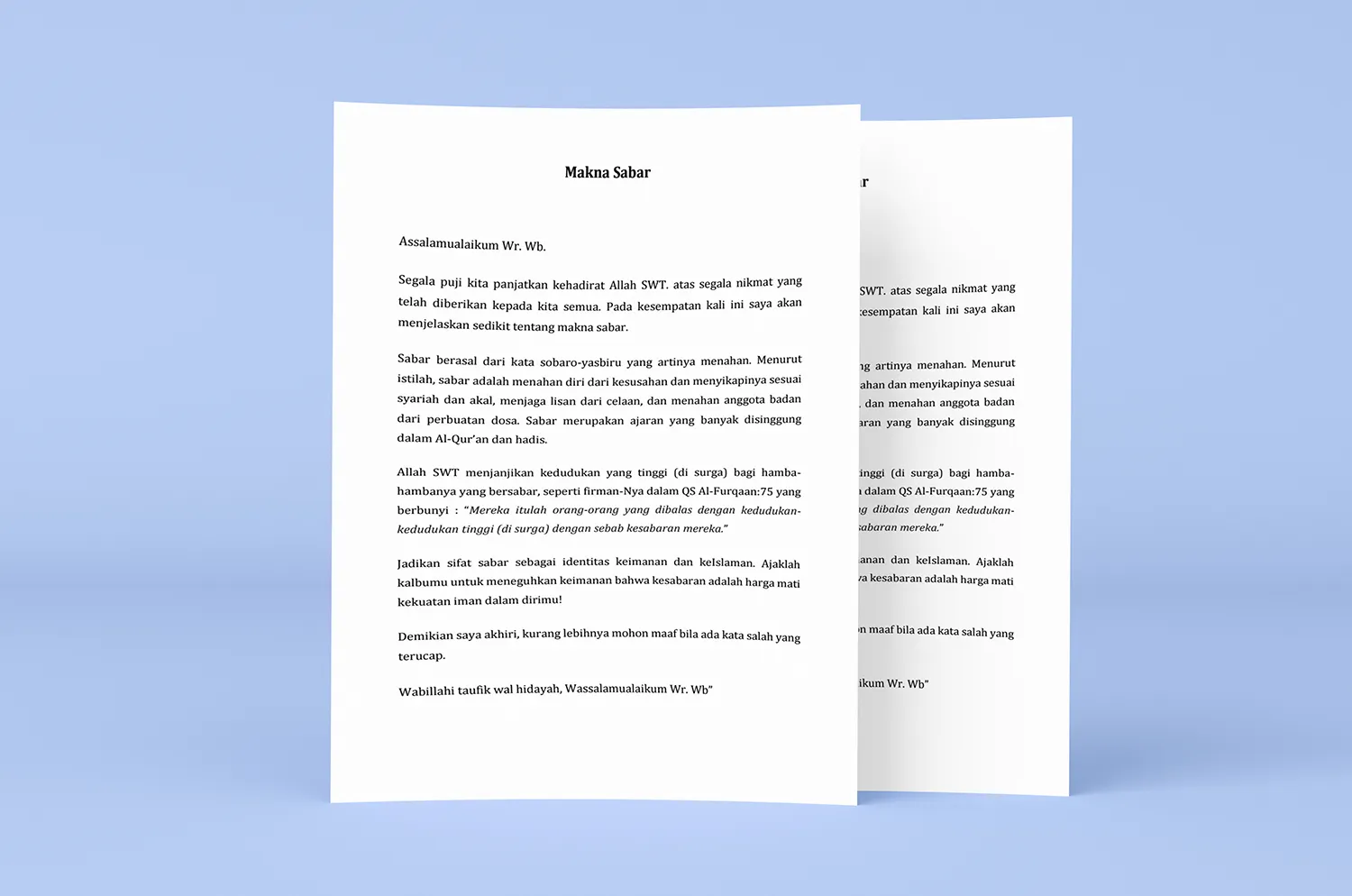 Hadirin yang saya muliakan, Hari ini, dengan penuh rasa syukur, kita berkumpul di sini untuk berbicara tentang sebuah nilai yang sangat penting dalam kehidupan kita, yaitu sabar dalam penantian.