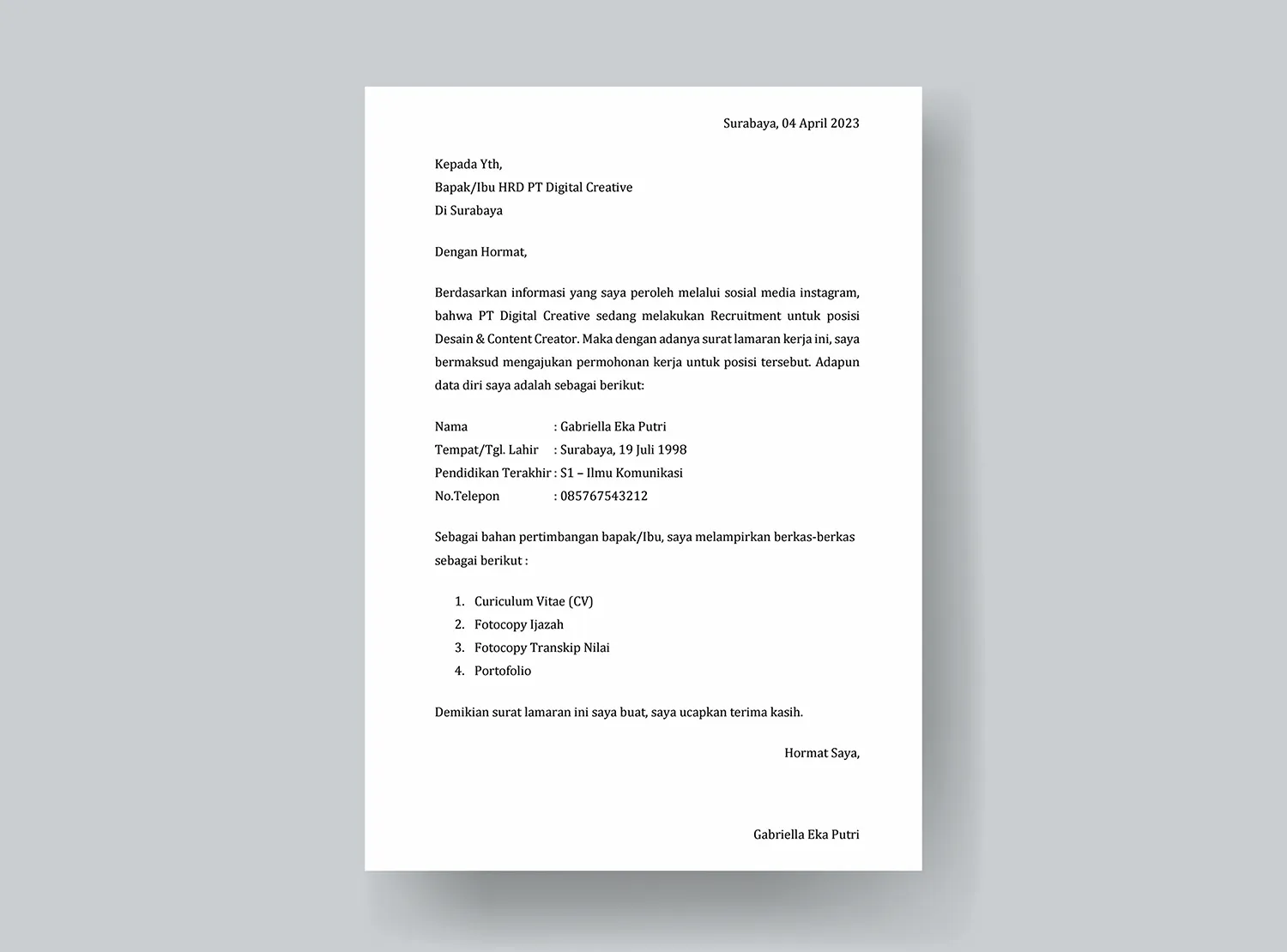 Sehubungan dengan informasi yang saya peroleh melalui sosial media instagram @lokersurabayakerja, bahwa PT Digital Creative sedang melakukan Recruitment untuk posisi Desain & Content Creator. Maka dengan adanya surat lamaran kerja ini, saya bermaksud mengajukan permohonan kerja untuk posisi tersebut. Adapun data diri saya adalah sebagai berikut: