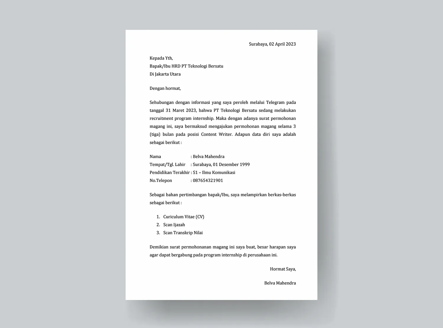 Dengan Hormat, Sehubungan dengan informasi yang saya peroleh melalui Telegram pada tanggal 31 Maret 2023, bahwa PT Teknologi Bersatu sedang melakukan recruitment program internship. Maka dengan adanya surat permohonan magang ini, saya bermaksud mengajukan permohonan magang selama 3 (tiga) bulan pada posisi Content Writer. Adapun data diri saya adalah sebagai berikut :