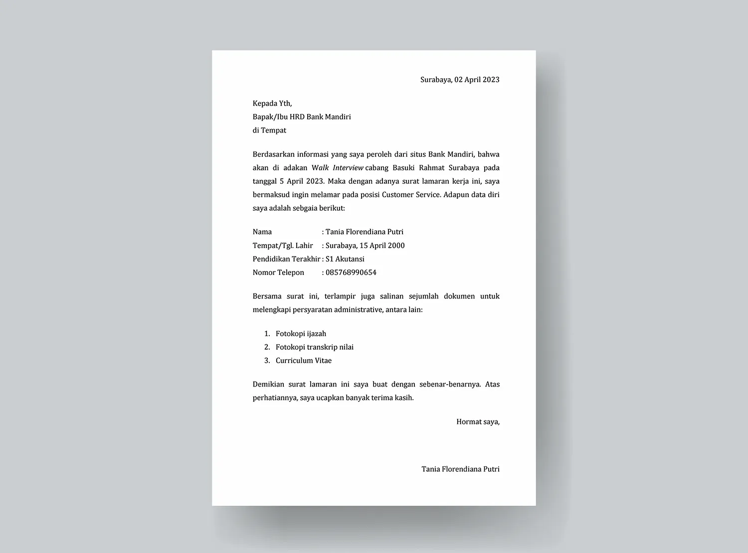 Berdasarkan informasi yang saya peroleh dari situs Bank Mandiri, bahwa akan diadakan Walk Interview cabang Basuki Rahmat Surabaya pada tanggal 5 April 2023. Maka dengan adanya surat lamaran kerja ini, saya bermaksud ingin melamar pada posisi Customer Service. Adapun data diri saya adalah sebgaia berikut: